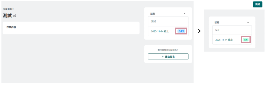 9.作業繳交完成後,可於「狀態」了解作業情形,顯示「已繳交」表示作業已完成繳交,等待老師批閱;顯示「完成」則表示老師已批閱。 繳交作業後,若對作業有任何問題,皆可以「建立留言」詢問。