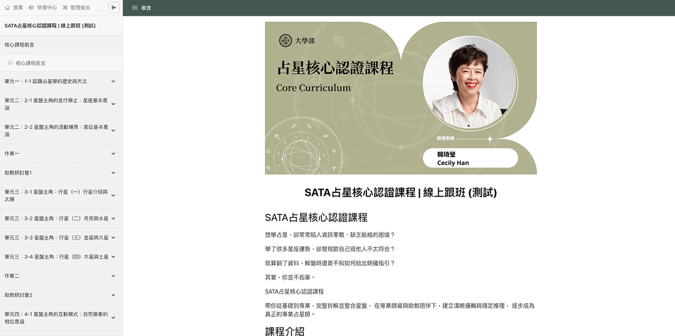 3.進到課程後,會先出現課程簡介,可下滑找的「開始觀課」按鈕,或是從左側欄位點選課程單元開始 。