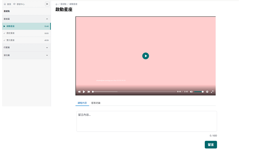 4.點選課程單元後,即可開始觀看課程影片,下方「課程內容」會有該單元的所有課程影片;「留言討論」學員可自行發問或是留言課程相關問題,教師將於後台內進行回覆