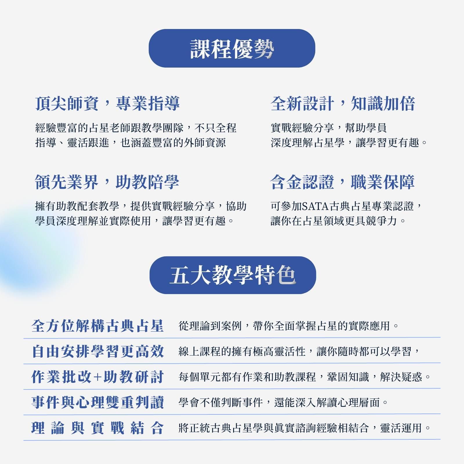 本課程教授所有知識點皆為正統的古典占星重要概念,皆有據可依、標明出處,加上老師們的大量諮商實證經驗,一步步的推理與分析皆有穩定的邏輯、判讀結論清晰有度。
