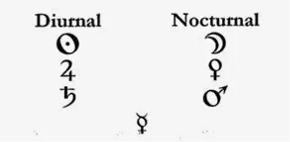 派系?!没错,行星就如同人们一样,有它的原则与偏好,因此喜欢从属依附的派系,有的行星喜欢在白天出现,有的行星喜欢在黑夜出现,因此喜欢白天的行星遵循太阳的领导,称之为日间(Diurnal)行星,喜欢黑夜的行星遵循着月亮的领导,称之为夜间(Nocturnal)行星,因此区分成两个派系,那就是: