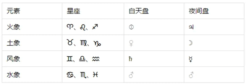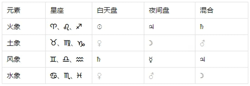 为何日间行星喜欢出现在日间星盘中呢? Ptolemy认为吉星☉、♃较为热,适合日间运作,☽、♀较为湿冷,适合夜间运作;但凶星♄较冷,宜配置于日间,才能透过白天的热去压制它的凶性;而凶星♂较热,宜配置于夜间,才能透过夜间的湿去压制其凶性。