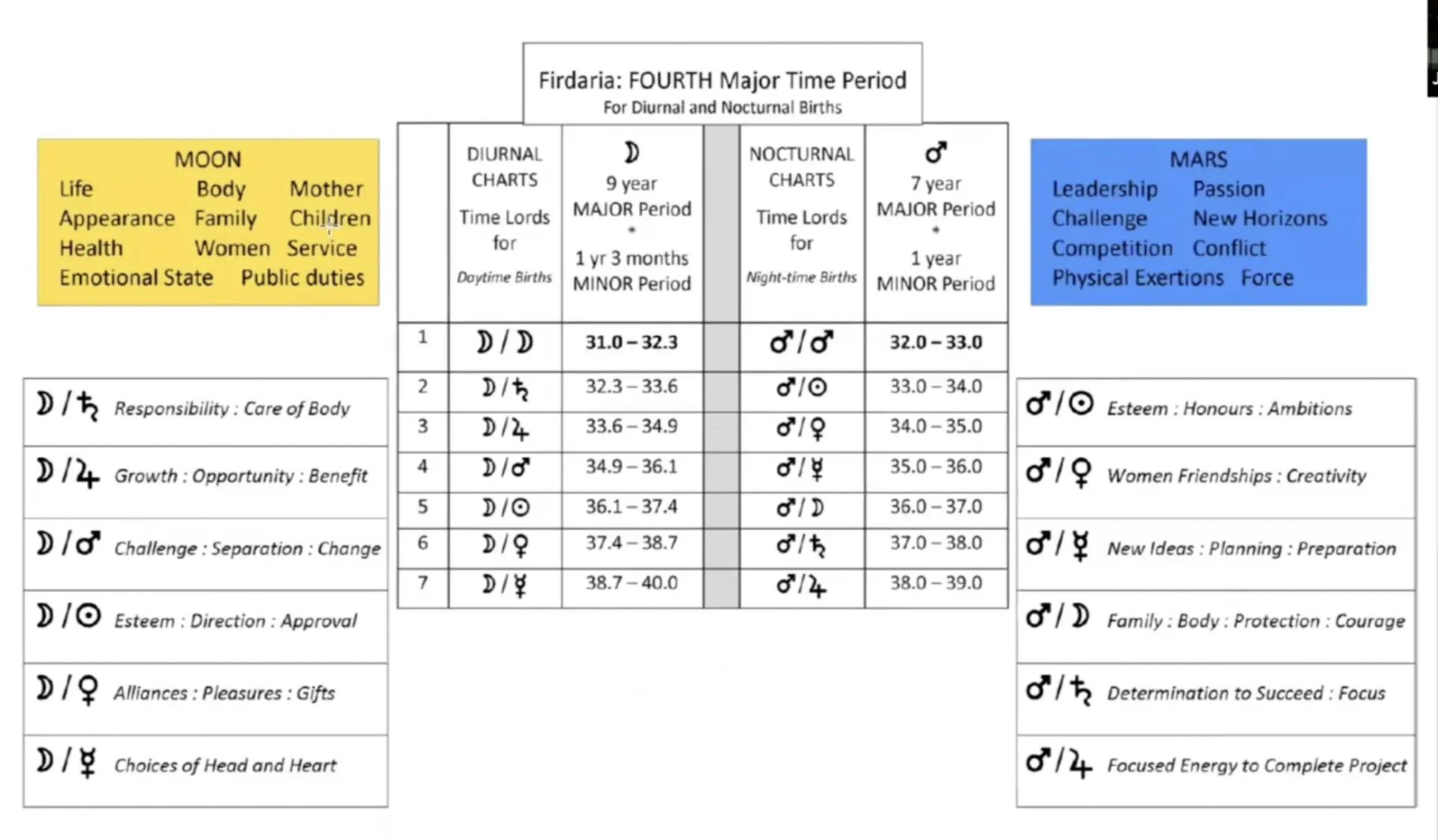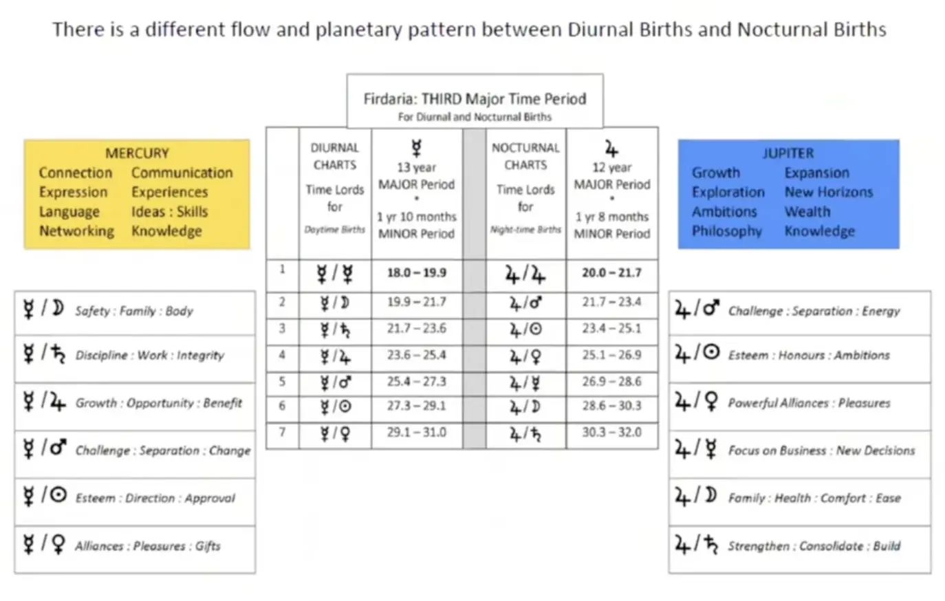 • 日間盤(太陽在地平線以上): 人生前 10 年由太陽掌管,接著是金星、水星、月亮、土星、木星,最後是火星 。
