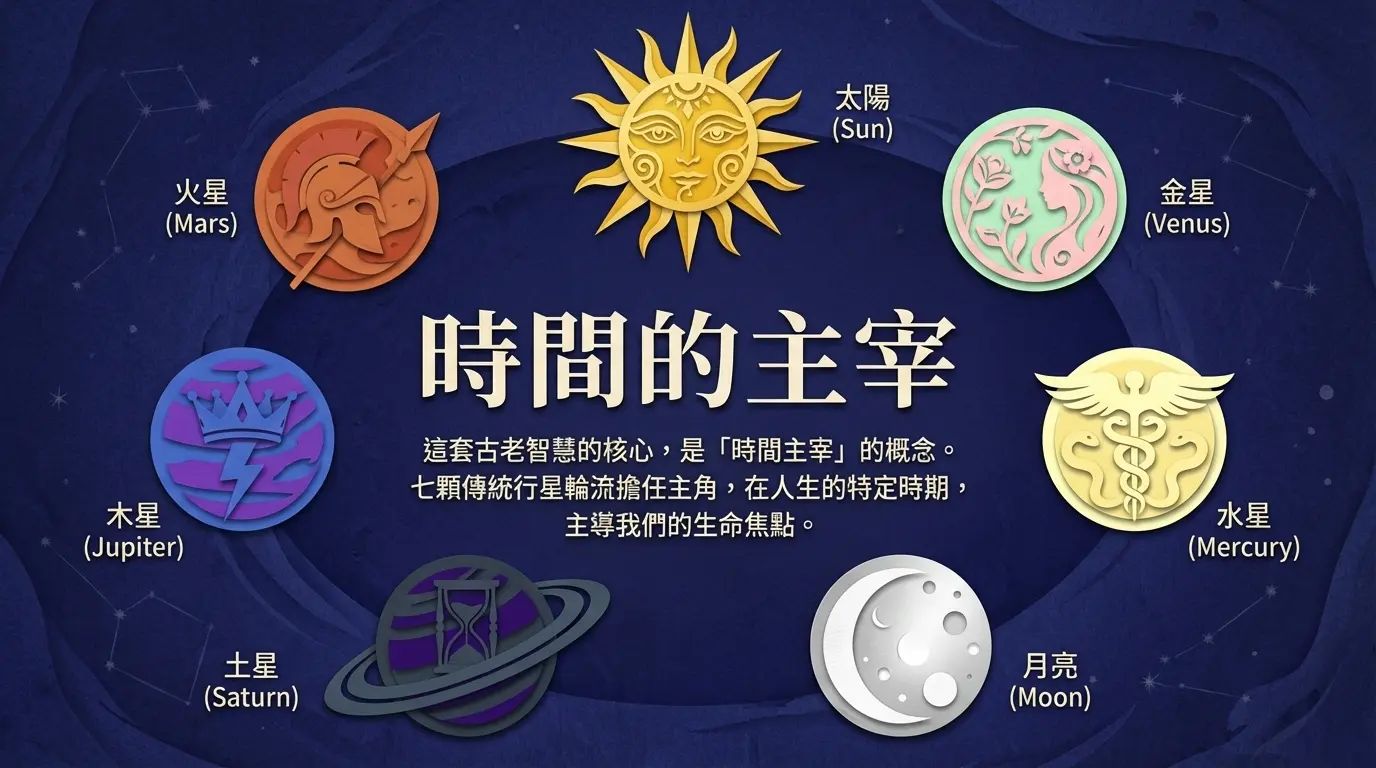 Joy 老師解釋,法達運程法(Chronocrators,希臘文意為「時間領主」)認為,七顆可見行星會按照特定的節奏,輪流接管我們人生的不同時期 。這不僅僅是預測,更是星盤的心跳與基礎律動 。