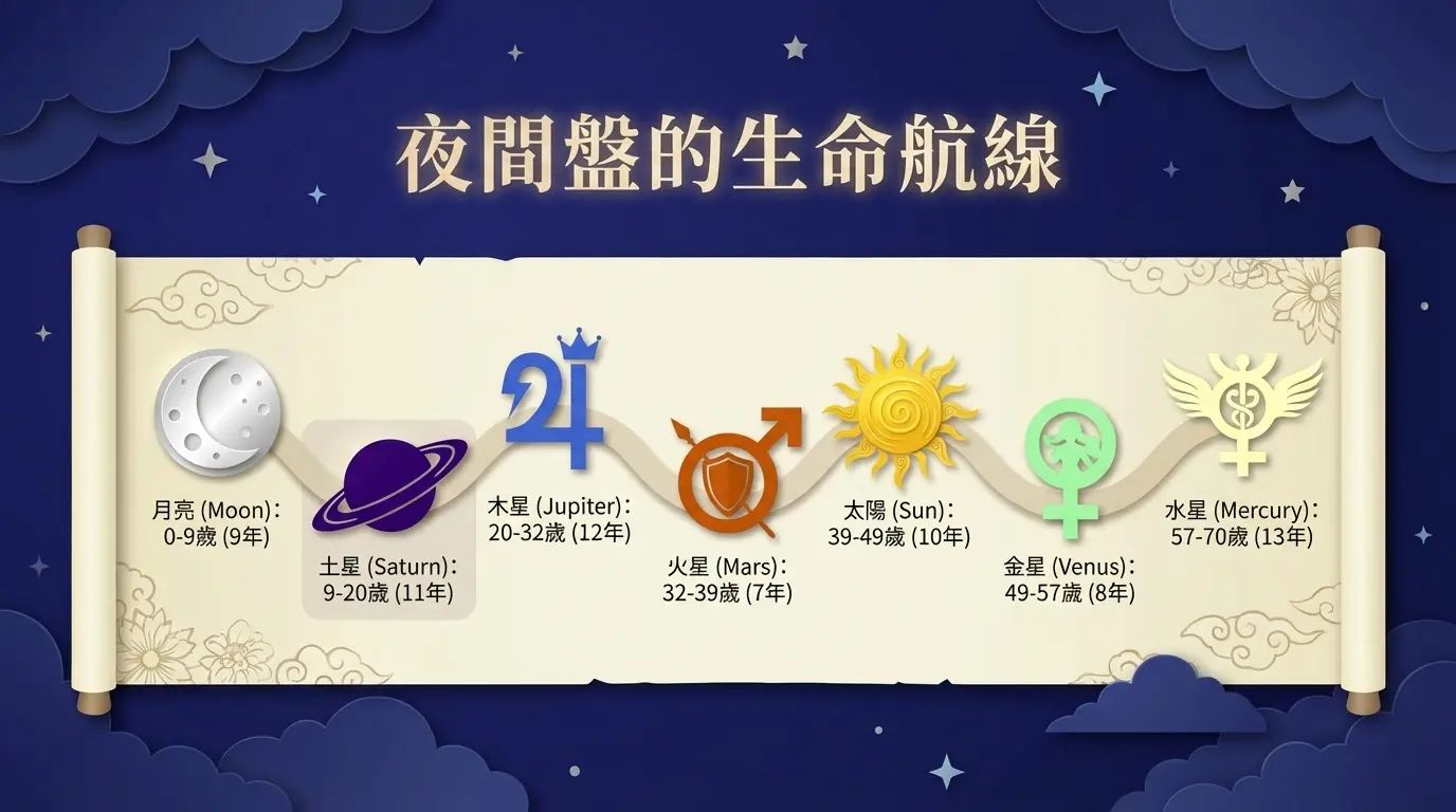• 夜間盤(木星大運,約 20-32 歲): 這 12 年由木星掌管,焦點在於成長、機遇與信念的建立。這是一段擴張生命經驗的旅程 。