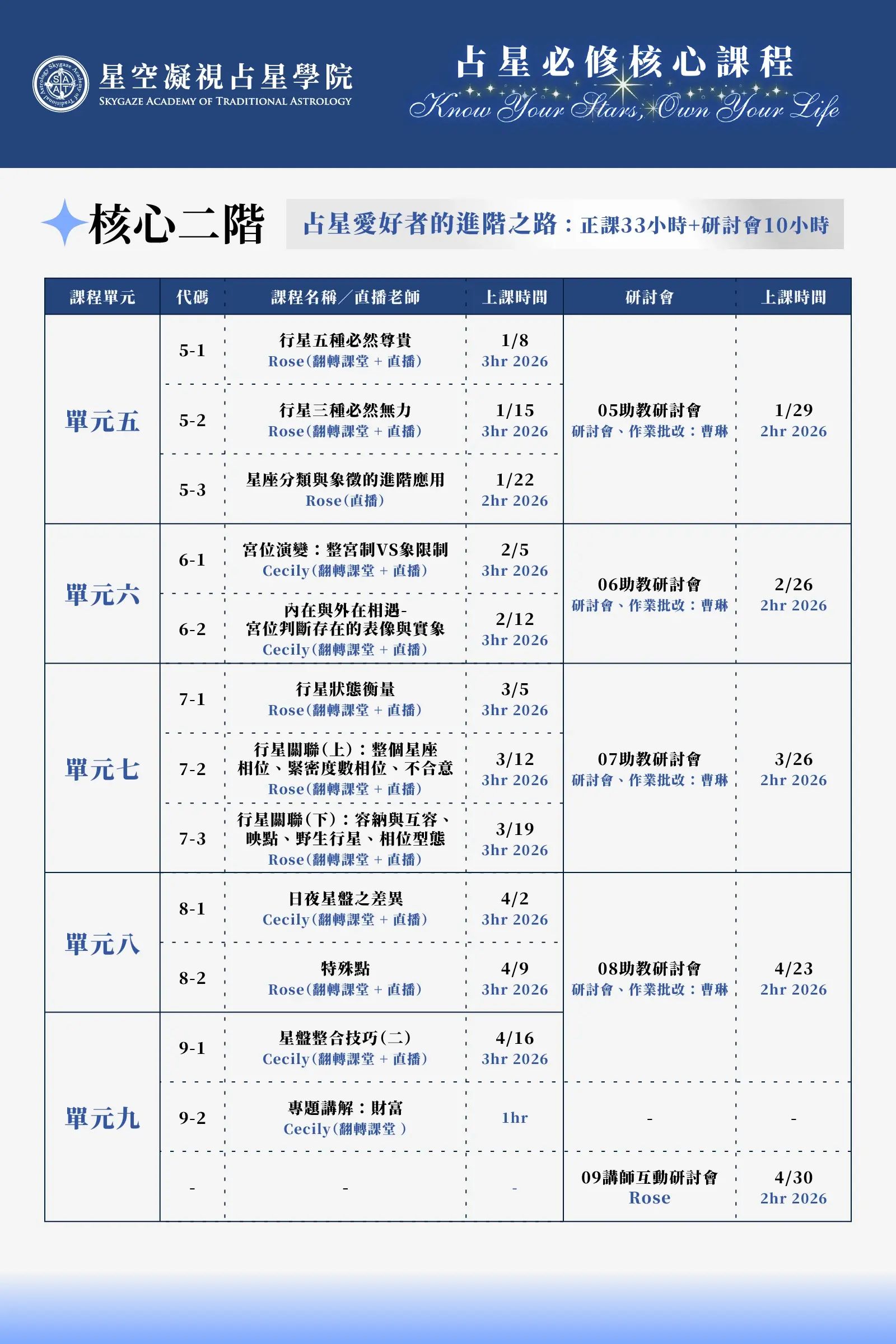 「二階課程:占星進階|學習行星力量判斷、古典技巧與宮位系統整合,提升占星判斷力。」