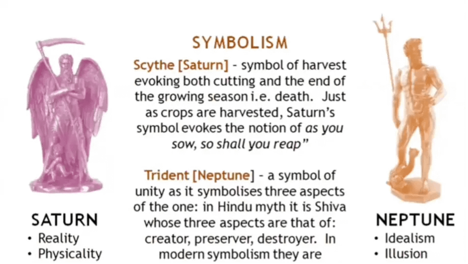 - 土星(Saturn): 象徵現實、物質世界的結構、權威與壓迫。它手持鐮刀,代表收成與因果——「種瓜得瓜,種豆得豆」。它是嚴格的老師,定義了邊界與規則。