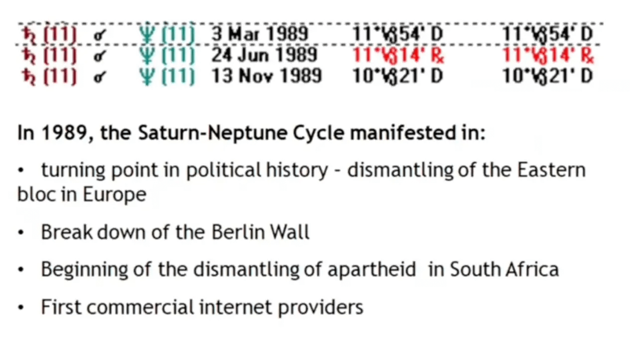 - 政治解體: 柏林圍牆倒塌,東歐劇變,蘇聯解體。堅固如土星的政治鐵幕被海王星的潮水沖垮,家庭重聚,但也帶來了分離的陣痛。