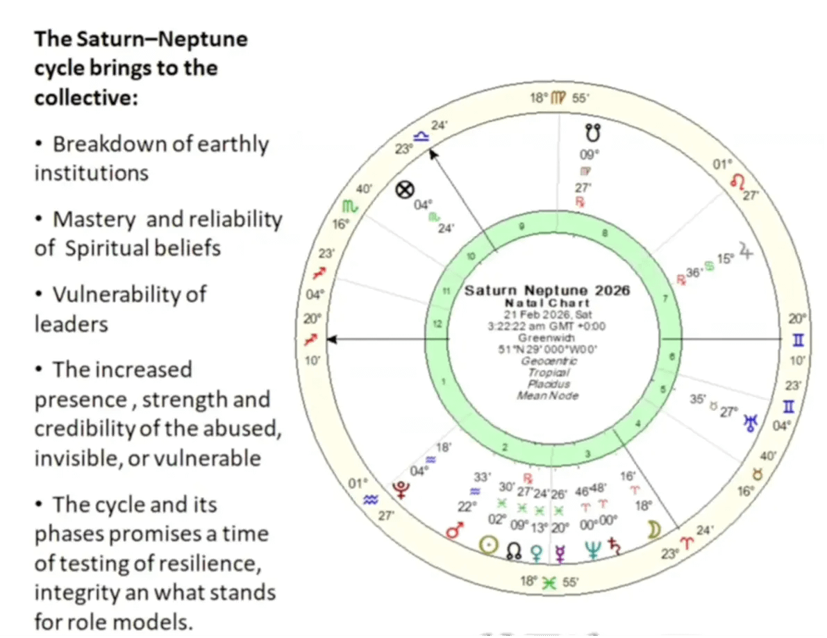土星海王星將帶來世俗機構的「消磁」。任何缺乏誠信、建立在謊言之上的機構或結構,都將面臨崩潰。這會帶來集體的失望與幻滅感,人們會發現那些曾經以為安全、穩定的權威,其實充滿了漏洞。