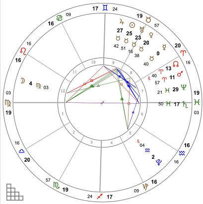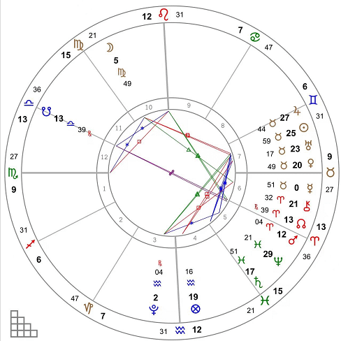 土星與其定位星木星呈離相位的四分相,木星的樂觀嘗試拯救土星,木星9宮,可能是人在異地生活,尋找各種異國體驗去舒壓,又可能用學術研究去抒解土星在人事關係上的壓力,可是木星處於黑膽汁的金牛座環境,難以自救。