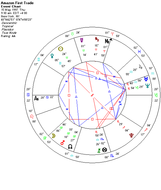 以下為三張成功的上巿盤。 第一張為蘋果計算機的上巿盤(過去五年上漲479.06%),上升點位於水瓶座的確符合蘋果作為高科技公司的形象,其現代主管行星天王星位於中天,與吉星金星會合,而太陽又與木星、冥王星及月亮呈吉相,十分符合現代占星學所認為的成功的上巿盤。 不過,就古典占星師的眼裡,金星在天蠍座是入陷的,與天王星的會合反而會強化其不穩定性,不能視為成功關鍵。 土星才是作水瓶座上升的主管行星,而土星是入旺的,這才是蘋果成為該領域佼佼者的原因之一。 此外,土星與日間盤同區分的大吉星木星會合,且木星還是代表社會財的十一宮主星,亦是太陽的定位星,這些皆代表蘋果的股票能獲得多數投資者的青睞。 最後,木星及土星位於幸運點的四尖軸,強化其在社會集資舞臺的幸運。